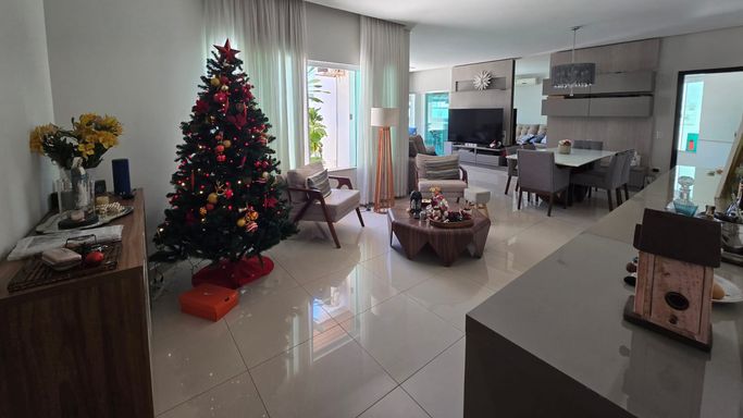 Casa impecável em condomínio! 5 quartos (4 suítes, incluindo 1 no térreo), suíte master com closet, duas duchas e banheira; sala ampla com 3 ambientes e muita luz natural; cozinha equipada com armários; varanda gourmet com churrasqueira e geladeira industrial; ofurô, pergolado e paisagismo; 3 depósitos, aquecimento solar e localização privilegiada em rua tranquila do condomínio.