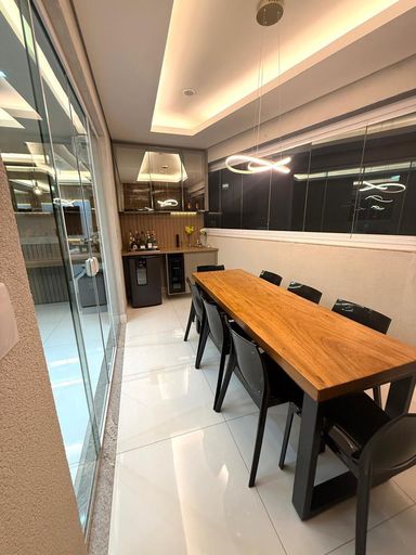 Apartamento moderno de 93m² com 3 quartos, incluindo uma suíte aconchegante; sala de estar e jantar integradas com painel planejado, cristaleira e sapateira que valorizam o ambiente; cozinha completa com armários sob medida e coifa; varanda gourmet perfeita para receber, com churrasqueira, bancada em granito e pia; banheiros elegantes com armários, box em vidro e espelhos; área de serviço funcional, separada e com armários planejados; escritório ou estação de estudos já mobiliado; piso em porcelanato em todos os ambientes; armários planejados em todos os quartos e 2 vagas de garagem (presas). Ideal para quem busca conforto, praticidade e estilo em um só lugar.