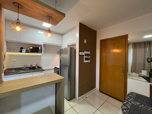Apartamento de 49 m², com dois quartos (um com guarda-roupa embutido branco), banheiro com box de vidro, armário sob a pia e revestimento amadeirado. A sala é ampla e iluminada, e a cozinha possui papel de parede. A lavanderia é integrada à cozinha e tem piso cerâmico cinza. Recentemente pintado de branco, o imóvel tem ambiente clean e moderno. O condomínio oferece área de churrasqueira coberta, equipada com geladeira, banheiro, ar-condicionado, pia e fogão. Está localizado no último andar de um prédio sem elevador, e a vaga de estacionamento não é coberta, mas está prevista melhoria nas coberturas. O prédio conta com quadra infantil, parquinho e portaria de segunda a sexta-feira, das 06:00 às 18:00. A localização é excelente, ao lado do supermercado Super Max, em frente a uma igreja, e próximo a diversos comércios e serviços como academia, padaria, farmácia, hospital, entre outros.