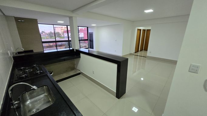 Com frente totalmente em vidro, o apartamento é extremamente iluminado e bem ventilado, valorizando ainda mais o acabamento de alto padrão. A cozinha americana com cooktop complementa o projeto moderno e funcional.
