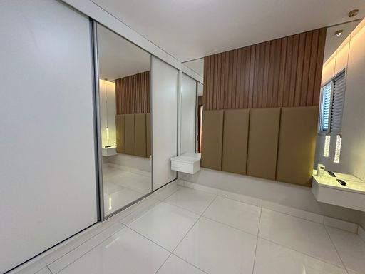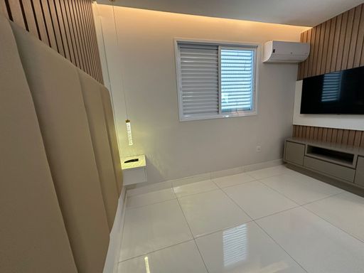 Projeto de iluminação, guarda-roupa planejado, criado suspenso, cabeceira estofada, painel de TV com armário, ar-condicionado 12.000 BTUs inverter e Smart TV 55”.