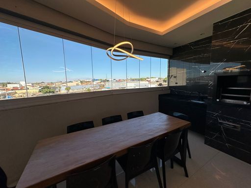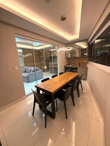 Churrasqueira revestida em porcelanato, cortina de vidro, cristaleira, lustre em LED, mesa de madeira maciça para 8 lugares com cadeiras, adega e cervejeira.