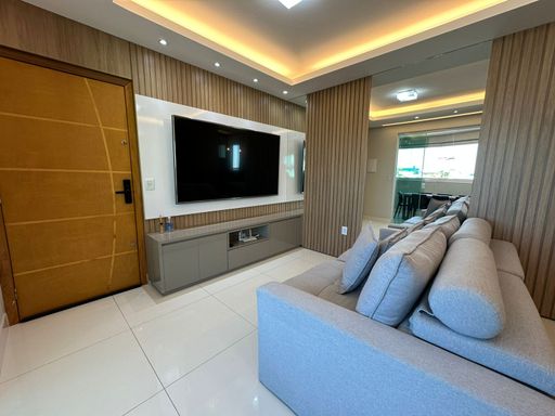 Projeto luminotécnico moderno, móveis planejados, Smart TV 75”, ar-condicionado 12.000 BTUs inverter, sofá retrátil e reclinável de 2,40m.