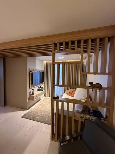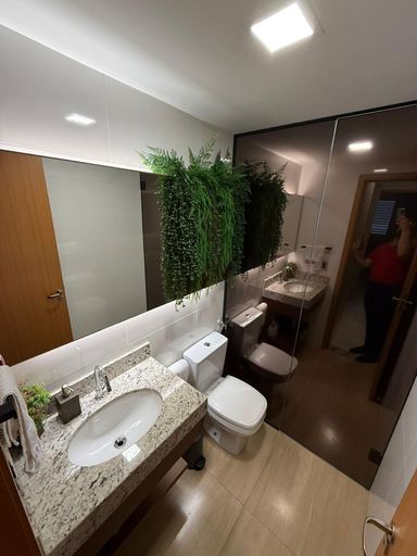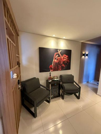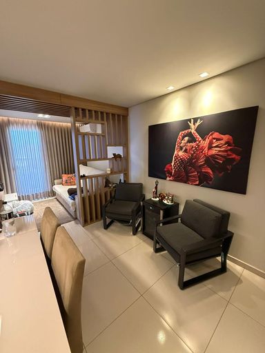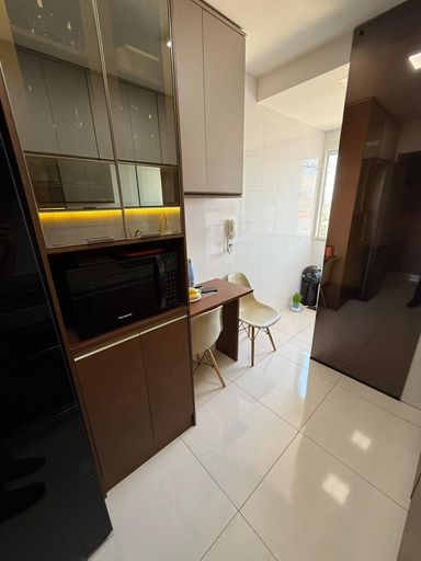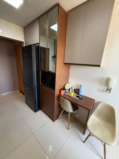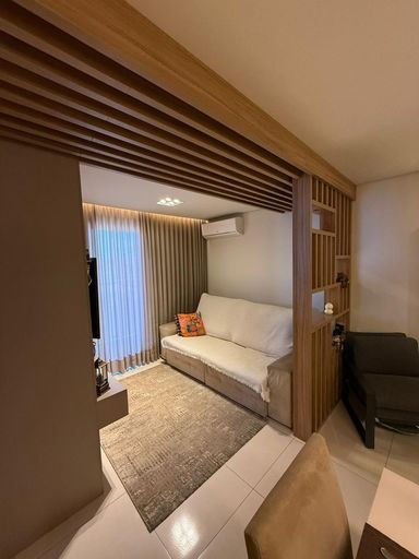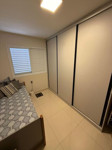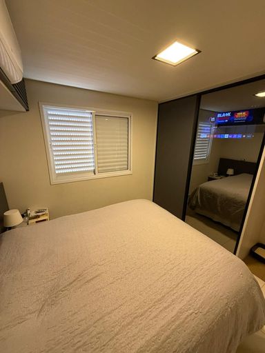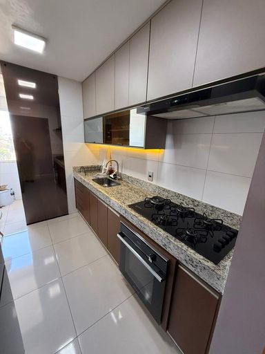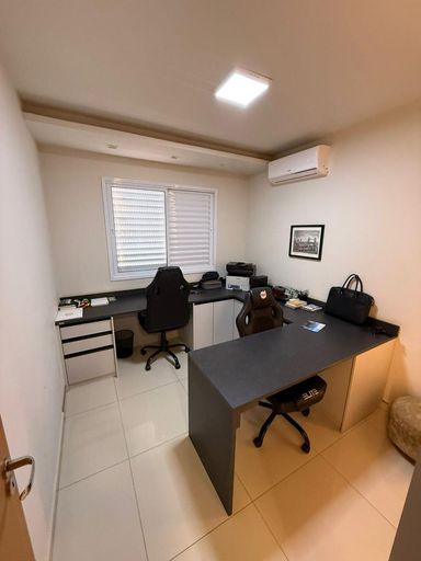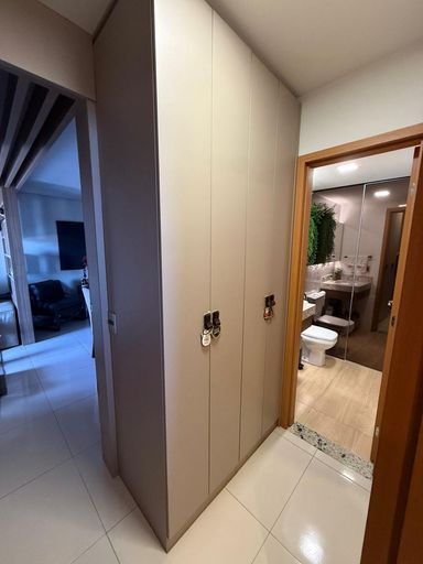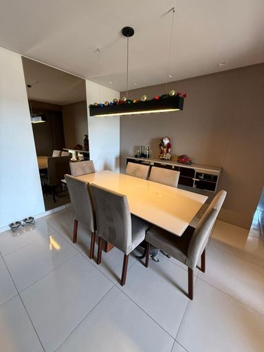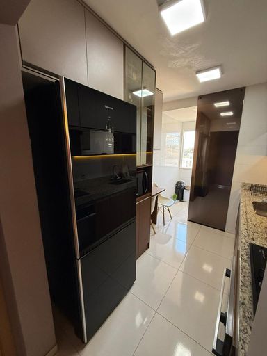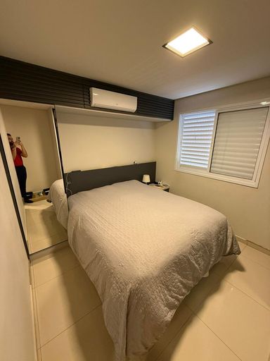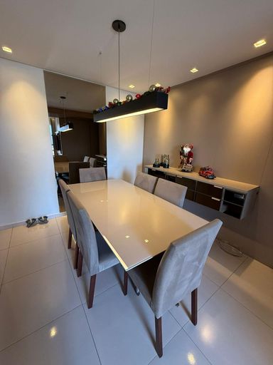 São 3 quartos, sendo 1 suíte, 2 banheiros e 2 vagas de garagem. O imóvel conta com móveis planejados em todos os ambientes, 3 ar-condicionados (inclusive na sala), projeto luminotécnico e fechadura eletrônica com olho mágico digital.