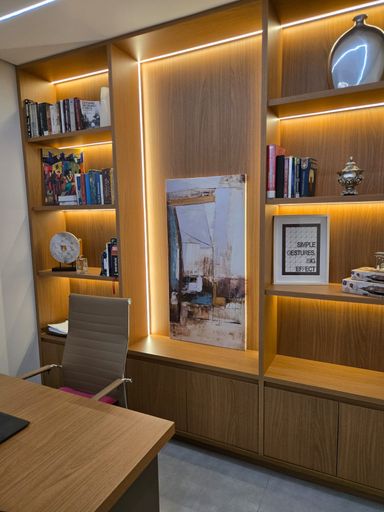 - Suíte com armários, painel e mesa planejada.