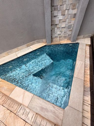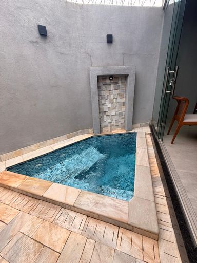 A cozinha é planejada e equipada com coifa, forno e micro-ondas, e a casa possui acabamento em porcelanato. Na área externa, destaca-se o espaço gourmet com churrasqueira, armários planejados e porta em Blindex, integrado à jacuzzi aquecida com hidromassagem, cascata e iluminação em LED.