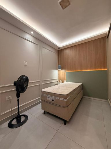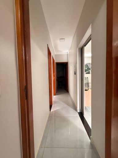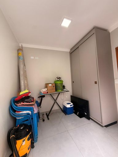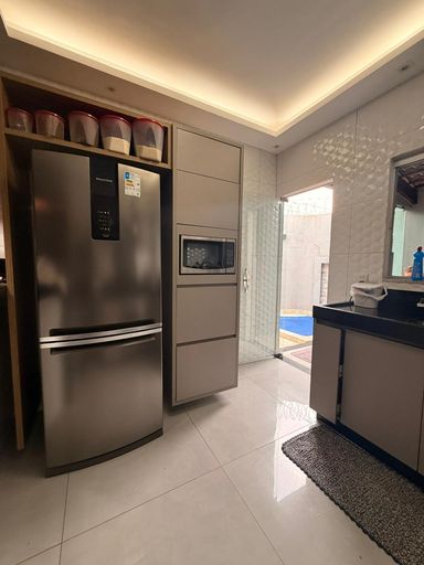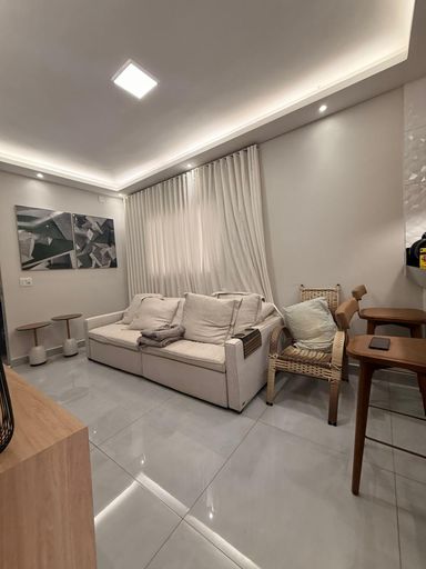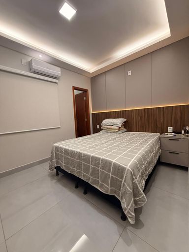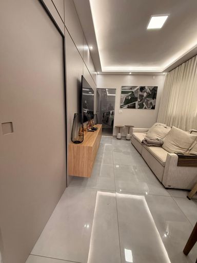 O imóvel conta com 3 quartos, sendo 1 suíte, todos com móveis planejados e iluminação em LED, além de ar-condicionado em dois quartos. A sala possui painel em toda a parede e porta que separa a área íntima dos quartos.