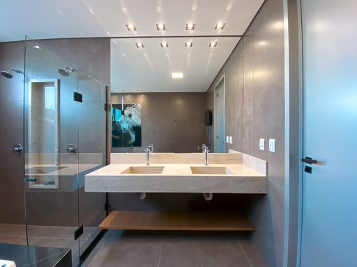 A cozinha e os lavatórios contam com acabamento em pedra Kalahari, agregando sofisticação aos ambientes. A área de lazer é integrada à cozinha privativa, proporcionando um espaço perfeito para receber e conviver com a família.