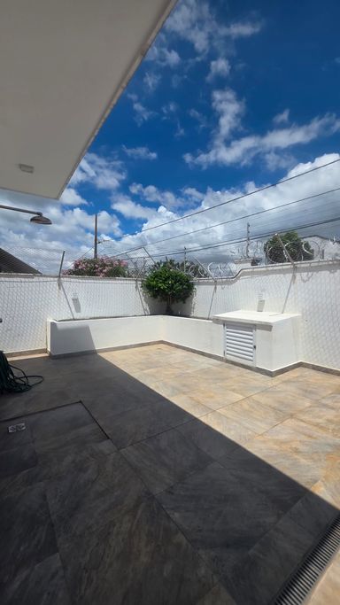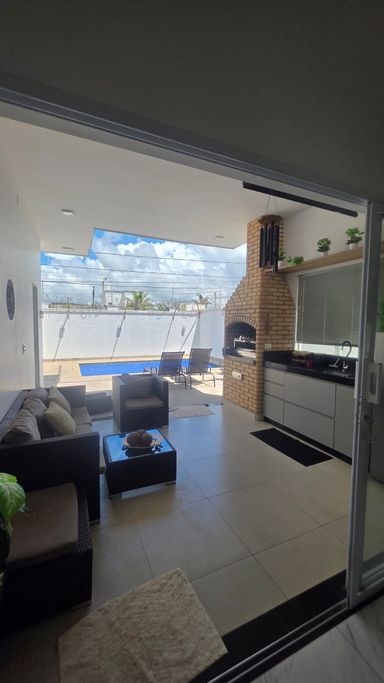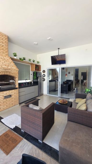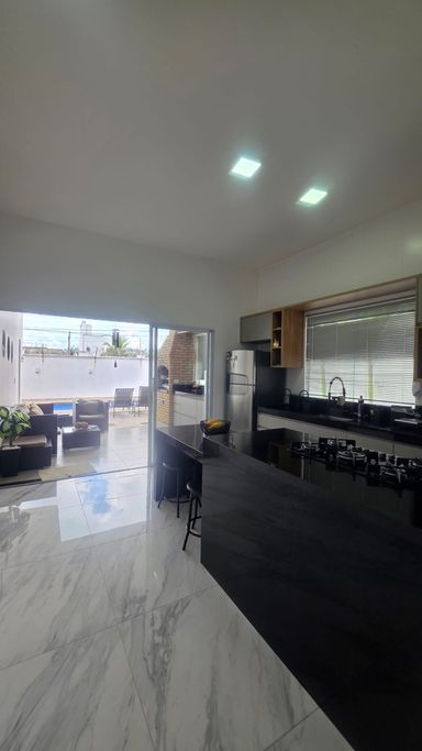A cozinha é funcional e equipada com armários, integrada à área gourmet com churrasqueira, ideal para receber. O imóvel ainda dispõe de escritório, lavabo, despensa e área de serviço.