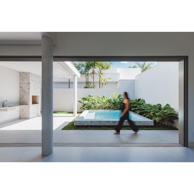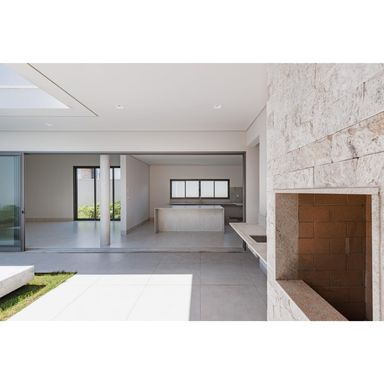 A casa possui ainda garagem coberta para 2 veículos, tomada para carro elétrico, boiler de 600 litros, esquadrias automatizadas na cor cinza, portas internas em ACM na cor champanhe, porcelanato Portinari e projeto de iluminação completo, reforçando o cuidado com acabamento, funcionalidade e modernidade.